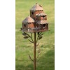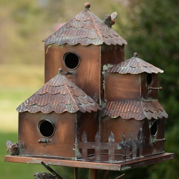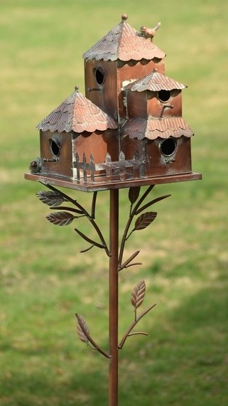 Our Country Style Birdhouse Stake Collection offers beautiful condominium home for feathered friends. Skillfully crafted with an antique copper finish that gradually weathers into a beautiful patina, each piece features several openings and perches for multiple birds. The "Plumsteadville" has a shingled roof that overhangs each side, a small picket fence, and small door with latch in the back (for easy cleaning).