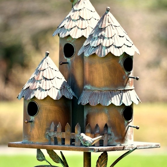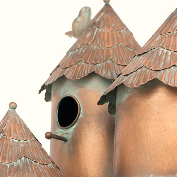 This birdhouse is crafted from 100% powder-coated iron and finished in a hand-painted antique copper look, combining durability with classic style. It features four 2" entry holes with matching perches, a spacious interior, and built-in drainage for practicality. The sturdy 4-prong stake provides excellent stability, while partial assembly is required. The birdhouse stands 26.8" tall (excluding the 49.95" stake) and comes in five styles—New Britain, Pipersville, Plumsteadville, Doylestown, and Dublin. Overall dimensions are 15.25" L x 12.5" W x 76.75" H.