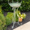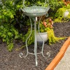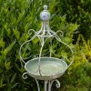 A freestanding indoor/outdoor accent stand featuring a durable powder-coated iron base and a handcrafted, hand-painted ceramic top with a distressed finish. Topped with a decorative ceramic ball, it comes in Cobalt Blue, Antique Bronze, or Frosted Green. Measures 14.57" L x 14.57" W x 44.88" H and weighs 6.62 lbs.
